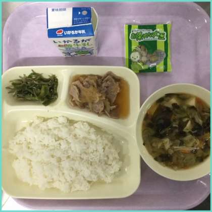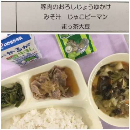 本日の献立は、豚肉のおろしじょうゆかけ、みそ汁、じゃこピーマン、まっ茶大豆です。