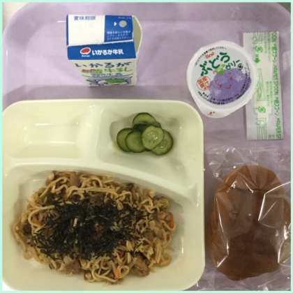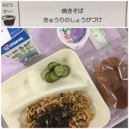 本日の献立は、焼きそば、きゅうりのしょうがづけ、ぶどうのゼリーです。