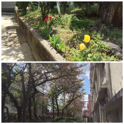 桜の花は、無情の雨と風で散り始めています。桜の季節の次に、ふじの花が咲く準備をしています。また、チューリップも咲いています。