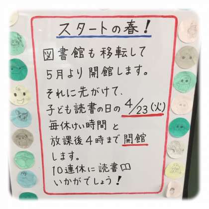 来週火曜日は、23日「子ども読書の日」です。それに合わせて、図書室を臨時に開館します。