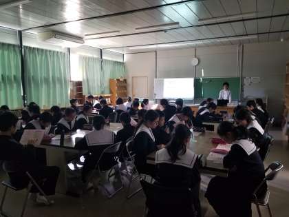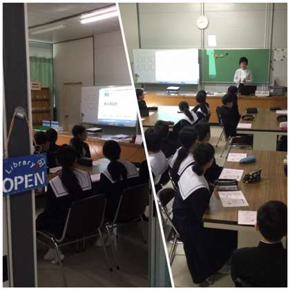 18日(木)の午後、一年生は、一クラスずつ図書室に入り、国語科の塚脇先生から図書室の使い方について、映像を使って、クイズ形式に学びました。