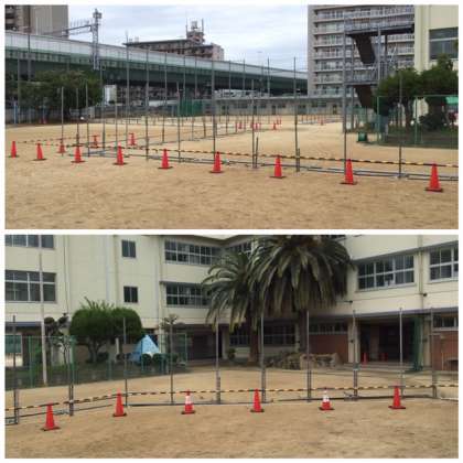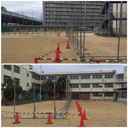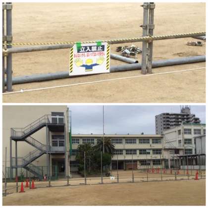 北館校舎建て替えに伴い、すでに正門を変更し、今までの南門を使用しています。また、工事に伴い、安全策として仮囲いが設置されています。