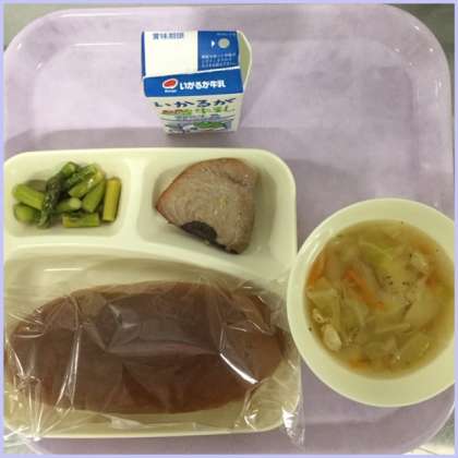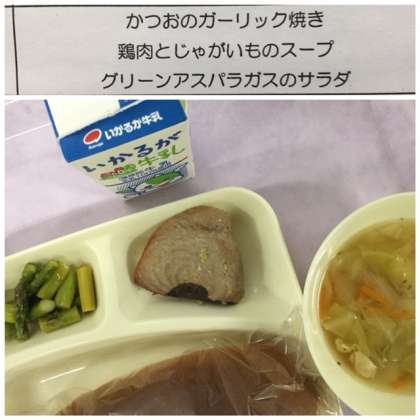 本日の献立は、カツオのガーリック焼き、鶏肉とじゃがいものスープ、グリーンアスパラガスのサラダです。