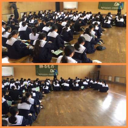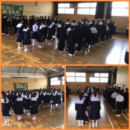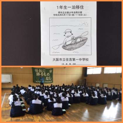来週金曜日(5/17)に迫った一年生の一泊移住の取り組みが進められています。格技室で、バスの乗車の隊形や集会の隊形なども練習をしました。