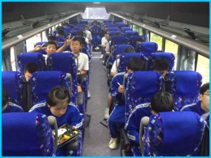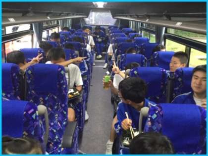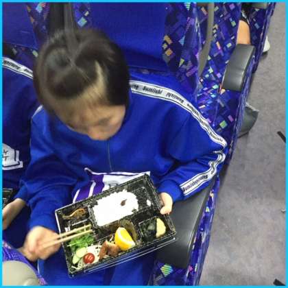 昼食場所に到着しました。芝生で昼食を取る予定でしたが、朝の雨で濡れていたので、バスの中で昼食をとりました。昼食中に、雨が降り始めました。雨中のラフティングになりそうです。