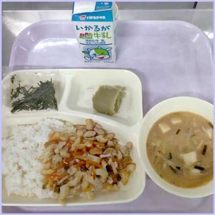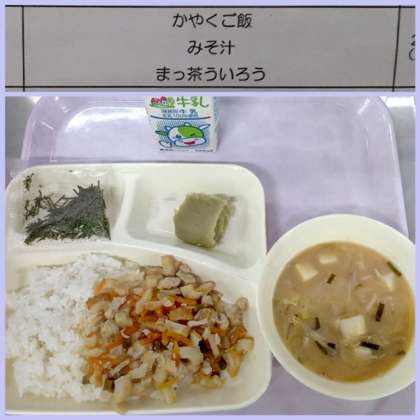 本日の献立は、かやくご飯、みそ汁、抹茶ういろうです。