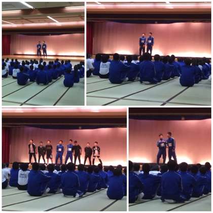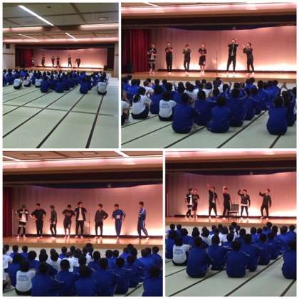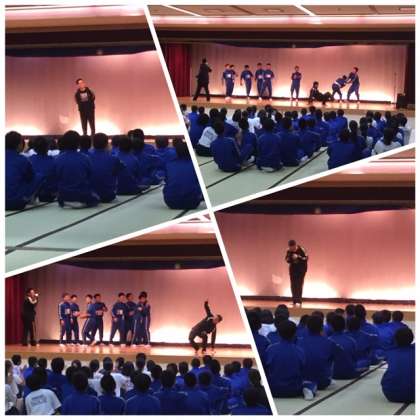 夕食後、学年全体で、レクレーション大会が行われました。開幕は、有志による漫才、コント、そしてソロの歌唱ステージ。そこへ飛び入りで、バックダンサー。