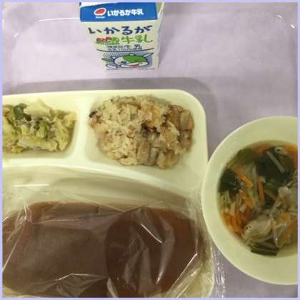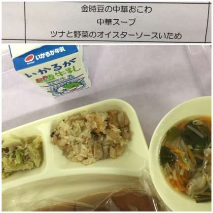 本日の献立は、金時豆、の中華おこわ、中華スープ、ツナと野菜のオイスターソースいためです。