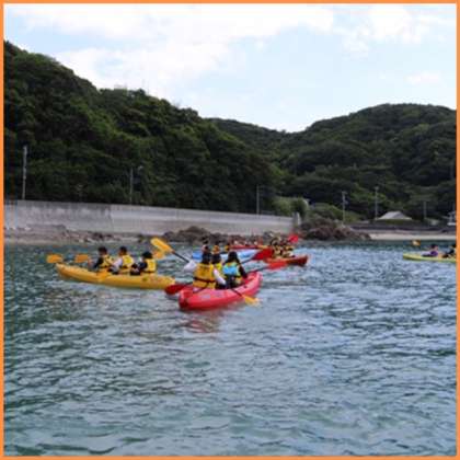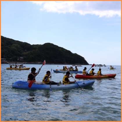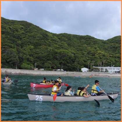 海に出て、活動。ライフジャケットでしっかりと身を守って、沖まで出て、カヤック(写真上の二つ)、カヌー(写真下段)の練習です。