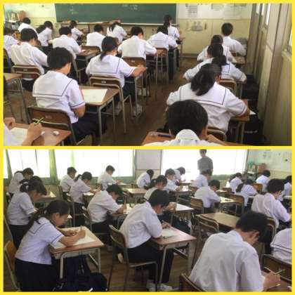 令和元年度 1学期 中間テストの初日。1年生は入学後初めての定期テストです。1限は、数学です。緊張した様子でテストに臨んでいました。(上段の2枚は、テストが配付され、始まりのチャイムが鳴る直前の様子です。)