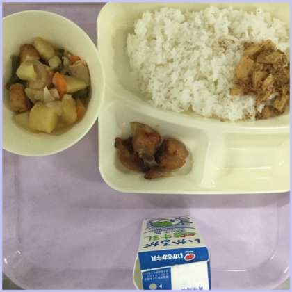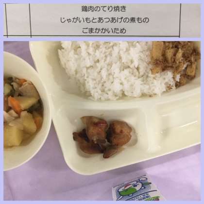 本日の献立は、鶏肉のてり焼き、じゃがいもとあつあげの煮物、ごまかかいためです。