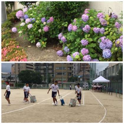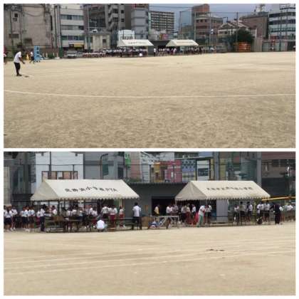 北粉浜小学校で、先発隊の皆さんが会場の準備中です。