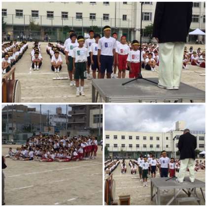 北粉浜小学校での運動会も閉会式を迎えました。予定より1時間以上おくれての開会式のため、個人種目は三年生に限定しました。1、2年生の皆さんには、少し物足らない運動会だったかも知れませんね。しかし、その中で、生徒の皆さんが全力で運動会に参加してくれました。特に、三年生がリーダーシップをとって、頑張ってくれました。これからの学校生活に活かしてください。また、北粉浜小学校の校長先生はじめ教職員のみなさんのおかげで、無事運動会を終えることができました。ありがとうございました。