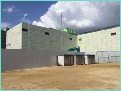 北館校舎はすっぽりと覆いがかけられ、外からは校舎の様子をうかがうことはできません。旧正門そばのアジサイはしっかりと咲いています。色も微妙な変化を見せてくれています