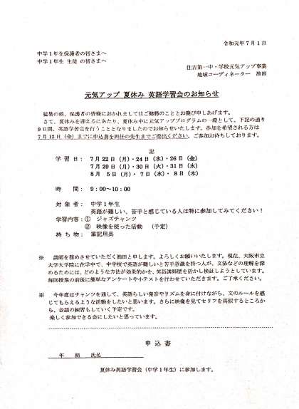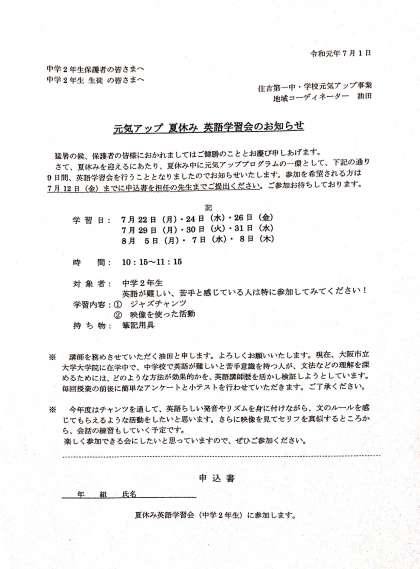 学校元気アップ事業 1・2年生対象の夏休み英語学習会案内7・1