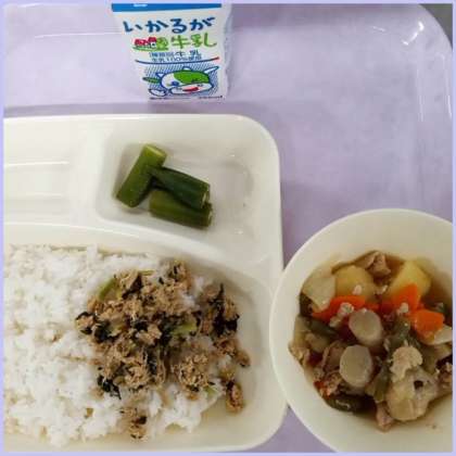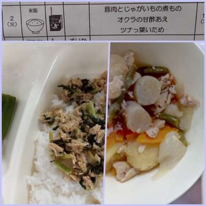 本日の献立は、豚肉とじゃがいもの煮もの、オクラの甘酢あえ、ツナっ葉いためです。