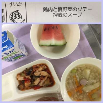 本日の献立は、鶏肉と夏野菜のソテー、押麦のスープ、すいかです。