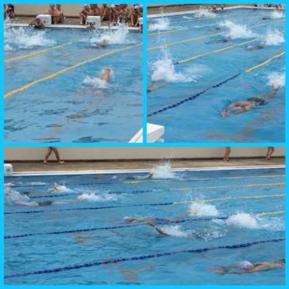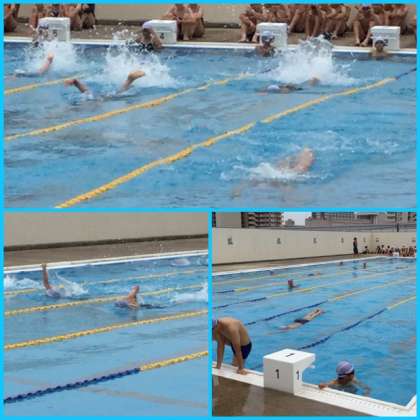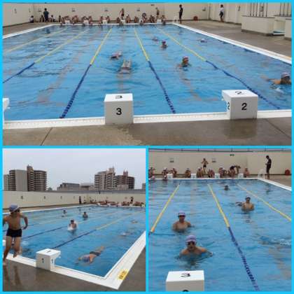 7月に入り、保健体育科では、水泳の授業が始まっています。写真は、2年生の授業で、けのび、バタ足、息継ぎの練習を行っています。