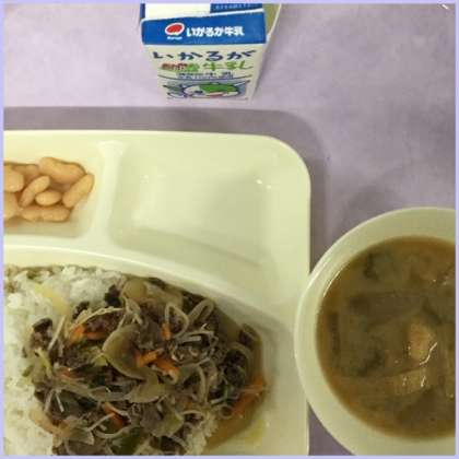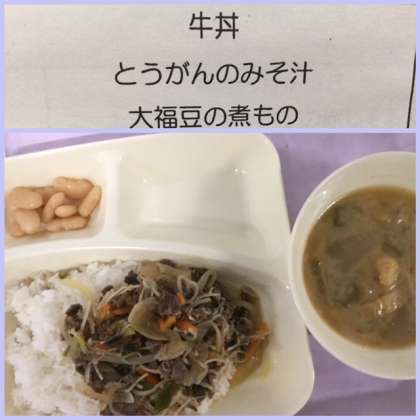 本日の献立は、牛丼、とうがんのみそ汁、大福豆の煮ものです。