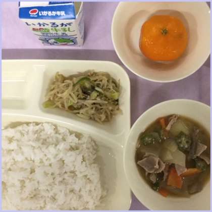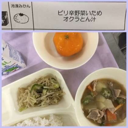本日の献立は、ピリ辛野菜いため、オクラとん汁、冷凍ミカンです。