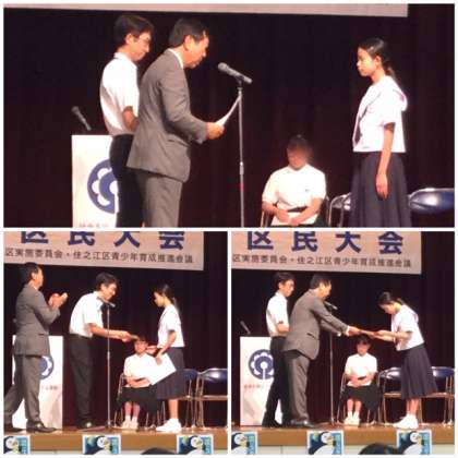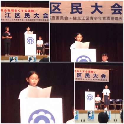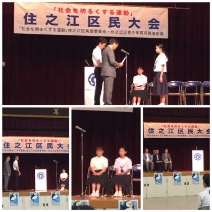 社会を明るくする運動住之江区民大会で、本校の住友さんが、作文の部で優秀賞をいただきました。区民ホールで表彰式がありました。その後、作文「短い会話が社会を明るく」を発表してくれました。