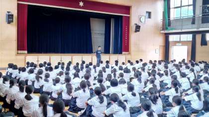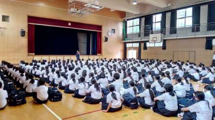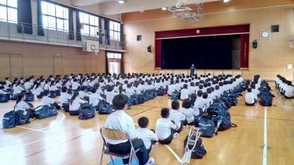 放課後に部活参加の部員全員が体育館に集合しました。その中で、泉原先生から夏休み中の部活についてお話がありました。要点は「部活の安全について」です。「体調を整えて参加すること、水分をしっかりとれるように普段から多めに持ってくること(ウォータークーラーの使えない日が夏休み中にあります)、学校や部活のルールを守って、夏休みの部活に参加するようにしよう。」というお話でした。