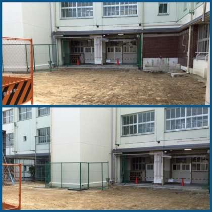 25日(木)の朝の北館校舎あとの様子です。下の写真は、南館と体育館をつなぐ通路の様子です。