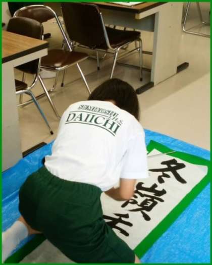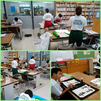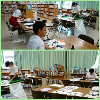 昨日に続き、書道部は、図書室で活動しています。大阪市の中学校総合文化祭に向けて、作品づくりに精を出しています。