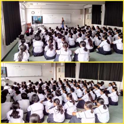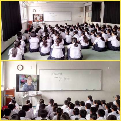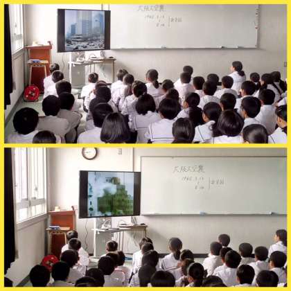 夏休み中の登校日。例年、全学年同時間に登校し、体育館で平和学習をしていましたが、暑さ対策として、多目的室で学年別に学習会を開催するため時間差登校を実施しました。1年生は、大阪空襲について学びました。
