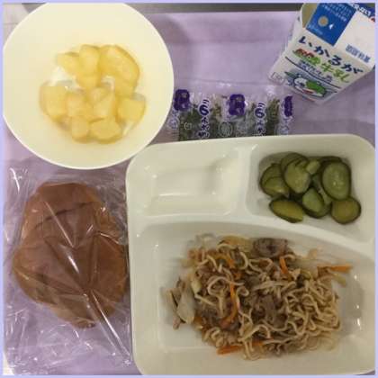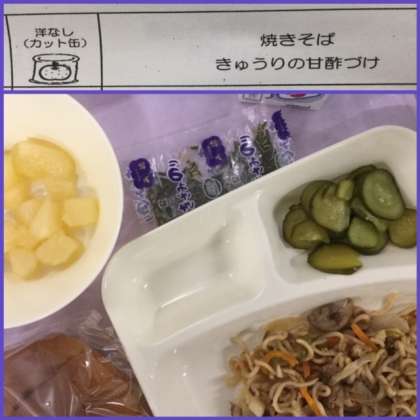 本日の献立は、焼きそば、キュウリの甘酢づけ、洋なし(カット缶)です。