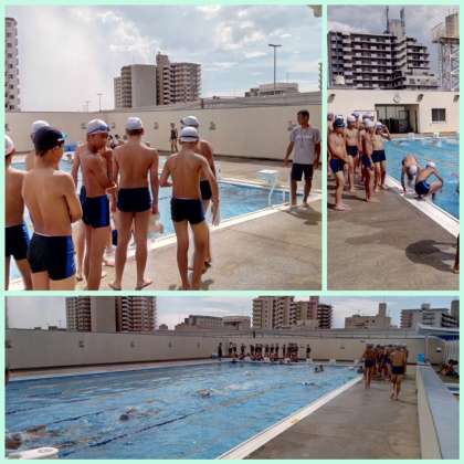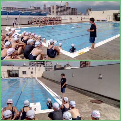 5限、2年1、2組の水泳の授業がありました。女子はドルフィンキックの練習。男子はターンの練習に励みました。