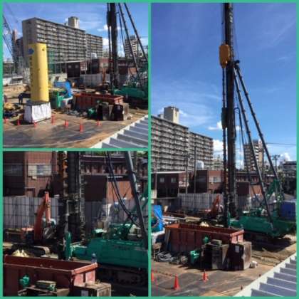 6日(金)、35度の猛暑日。北館校舎の工事現場では、重機が基礎工事を行っています。