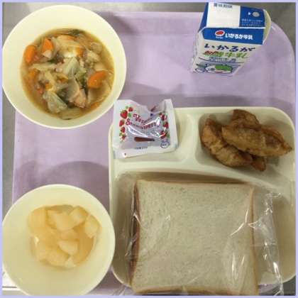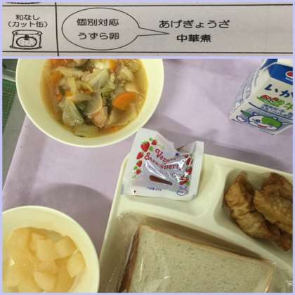 本日の献立は、あげぎょうざ、中華煮、和なし(カット缶)です。