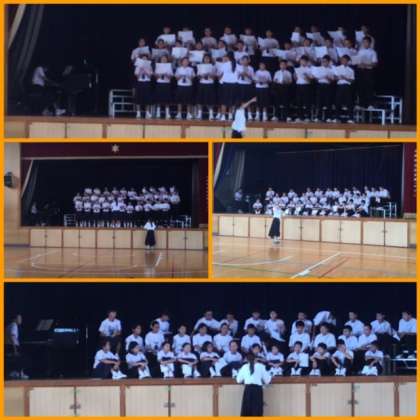午前、1年生は体育館、音楽室で学級ごとに合唱の練習を行いました。また、展示作品として、ちぎり絵を作成中です。