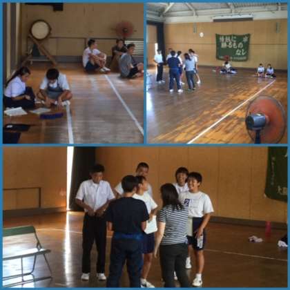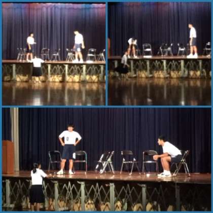 12日(木)午後、3年生は体育館、格技室、多目的室などで学級劇の練習と各教室では背景や道具類の製作に励んでいました。