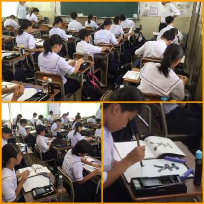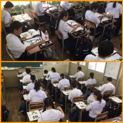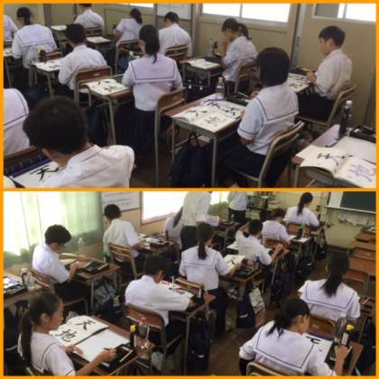 17日(火)より、授業の様子を1時間単位で見て回ります。まずはじめは、2限1年2組の国語の授業を見せてもらいました。書写の時間でした。