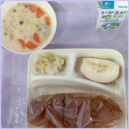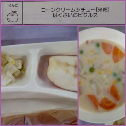 本日の献立は、コーンクリームシチュー、はくさいのピクルス、りんごです。