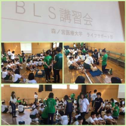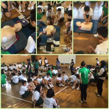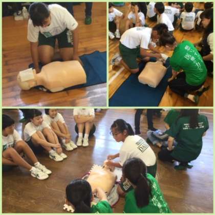 2年生は、格技室で、森ノ宮医療大学ライフサポート部の学生の皆さんにご協力いただき、救命救急を体験しながら学びました。各班に分かれ、そこに大学生のみなさんが数名ずつ入ってくださって、学びました。