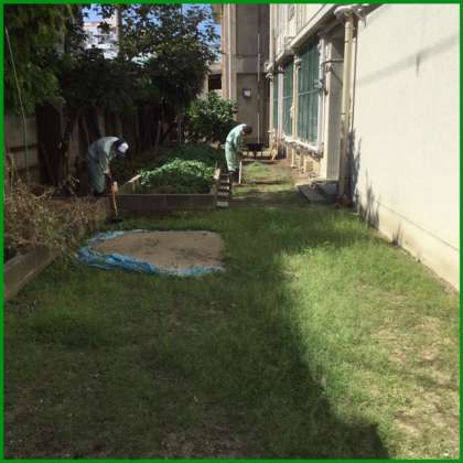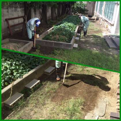 管理作業員さんが、校舎裏の雑草がいっぱいのところを整地してくださっています。朝晩が涼しくなったとはいえ、日なたはまだまだ暑い状況です。廃墟のような校舎裏にしないために頑張ってくださっています。しかし、整地しても10日間ほどしたら、雑草はまた目立つようになってきますとのこと。