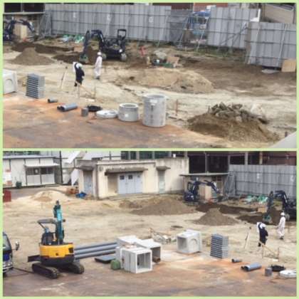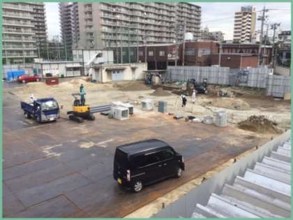 解体工事が終了し、基礎工事のくい打ちも済みました。さらに、工事が進んでいます。