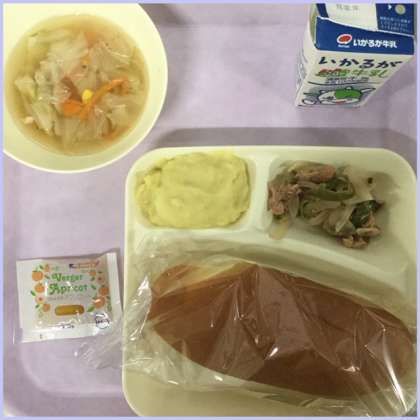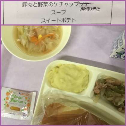 本日の献立は、豚肉と野菜のケチャップ風味焼き、スープ、スイートポテト、アプリコットジャムです。