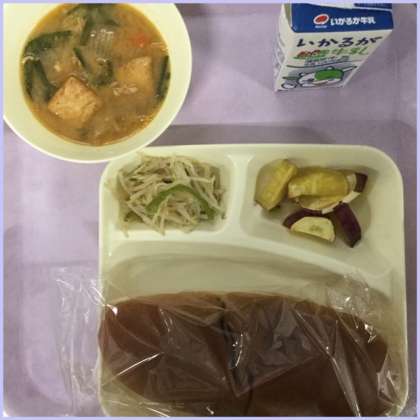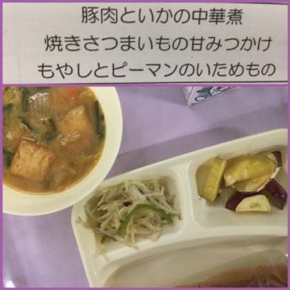 本日の献立は、豚肉といかの中華煮、焼きさつまいもの甘みつかけ、もやしとピーマンのいためものです。