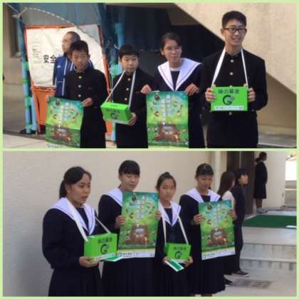 28日より生徒会のみなさんが、朝、「緑の募金」活動を始めました。ご協力、お願いします。また、全校朝礼では、SNSについて、今朝の読売新聞の記事(アイドルの瞳から居場所を探し当てた)などを例に挙げて、使い方について注意を促されるお話がありました。