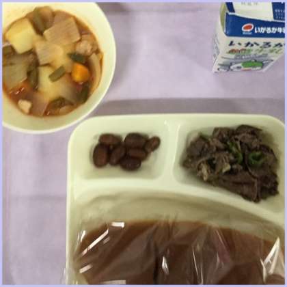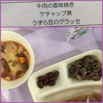 本日の献立は、牛肉の香味焼き、ケチャップ煮、ウズラ豆のグラッセです。