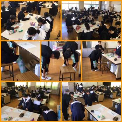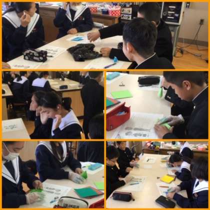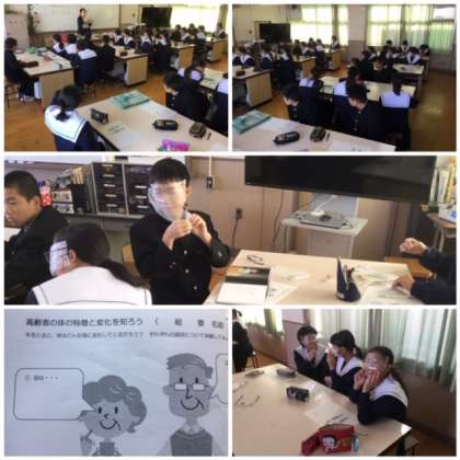 2限、1年3組は家庭科の授業です。家庭科では、「高齢者の体の特徴と変化を知ろう」というテーマで体験授業が行われました。難視メガネをかけて本を読む。脱脂綿を耳に入れて会話する。ビニル手袋で折り紙を折る。新聞紙を膝に巻きつけて歩行する。4つの項目の体験があり、それぞれ感想を記録しました。