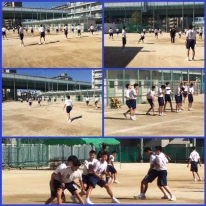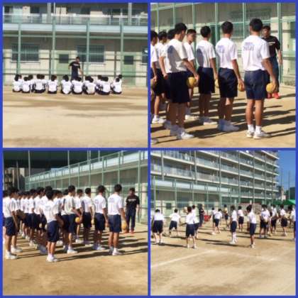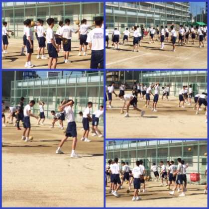 3限、3年1.2組の男子は、ハンドボールの授業です。ハンドボールに慣れるということを目標に授業が進みました。