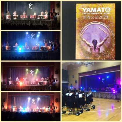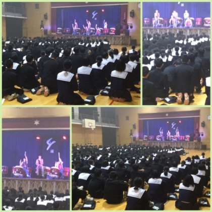 午後、全学年の生徒が体育館で、和太鼓演奏の鑑賞をしました。「魂源堂 倭」(kongendo YAMATO)の演奏を聞きました。