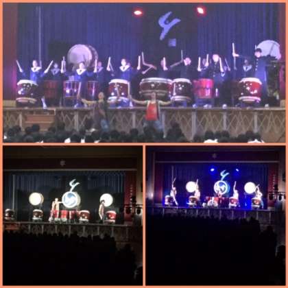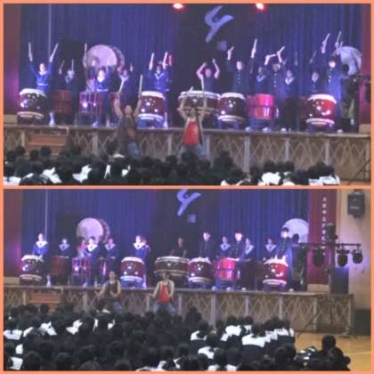 事前に選ばれていた生徒のみなさんが舞台に上がりました。森本先生も舞台に上がりました。(一番大きな和太鼓を演奏していらっしゃいました。)代表の生徒による演奏を楽しく聞きました。