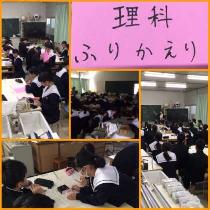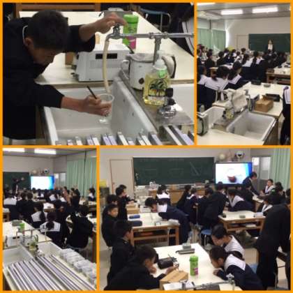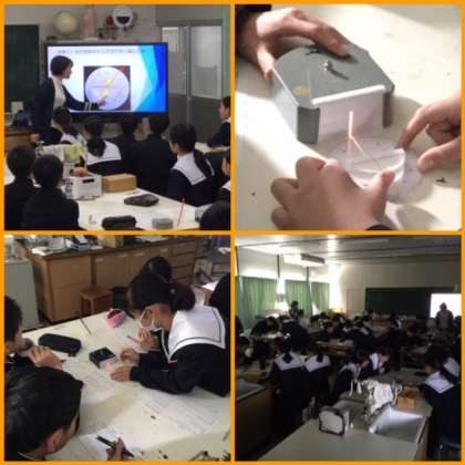 3年生対象には1学期に、そして、2年生対象には2学期9月に行った「授業研究を伴う校内研修」に取組みました。本日は、1年生対象に授業が行われました。2限は、理科室で「光の屈折」について学びました。