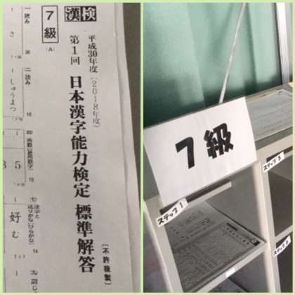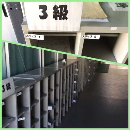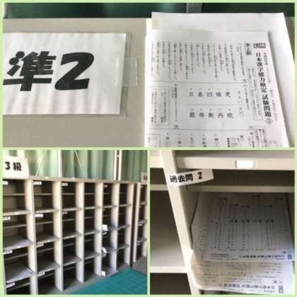 2年生の教室がある仮設校舎2階の廊下に、漢字検定のための学習プリントが並べられてあります。希望者は自由にそのプリントで学習できるようになっています。ホームルーム前の朝の学習会にも活用されています。